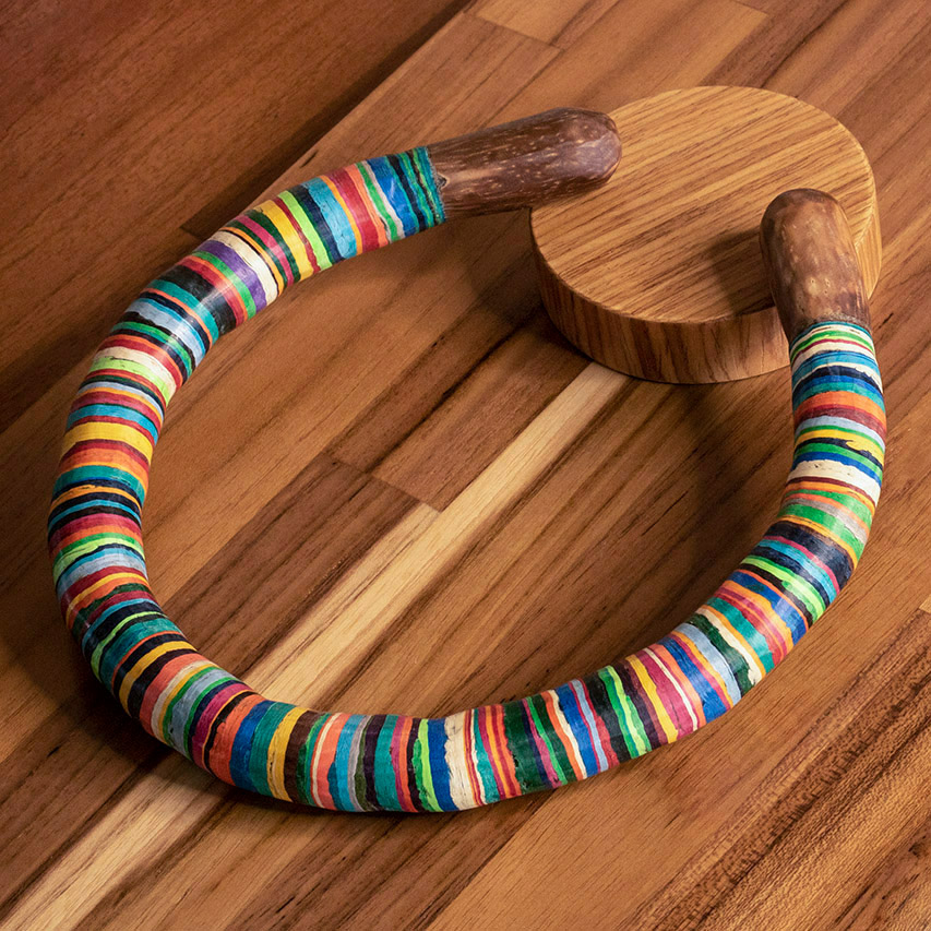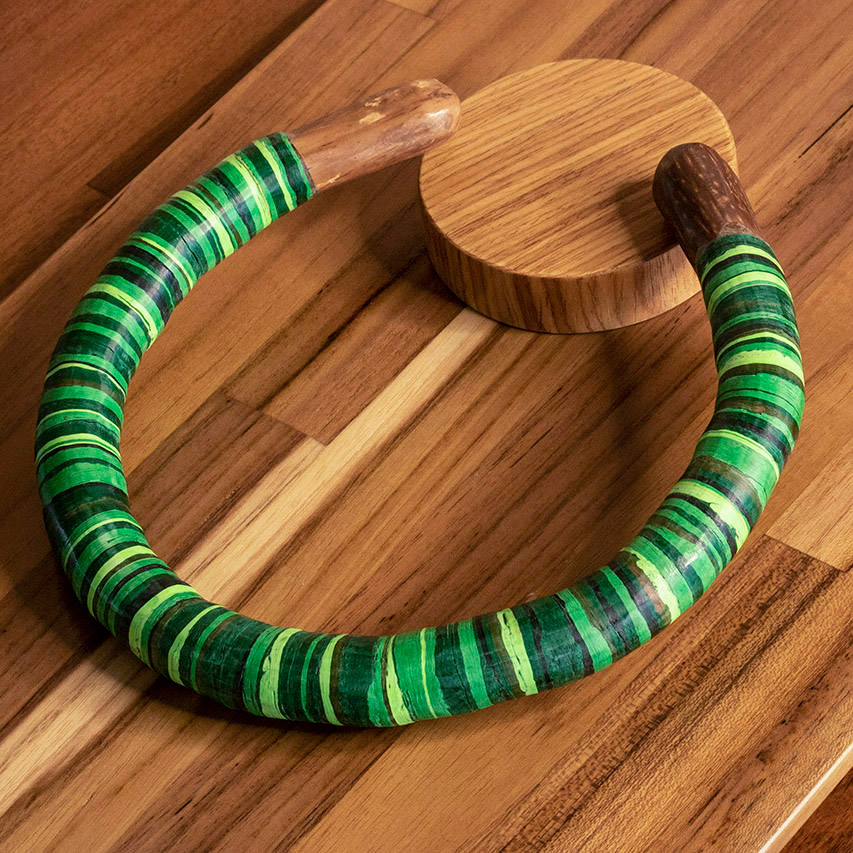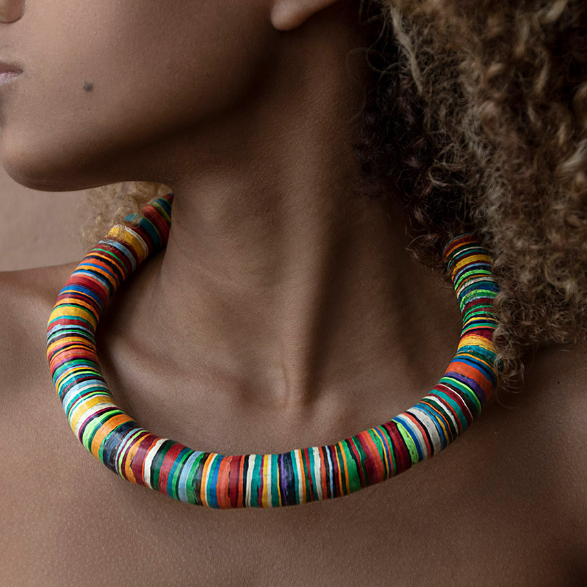 Handcrafted thick necklace. This necklace is predominantly made with piaçava coconut (Attalea funifera) from Bahia and small pieces of coloured paper.