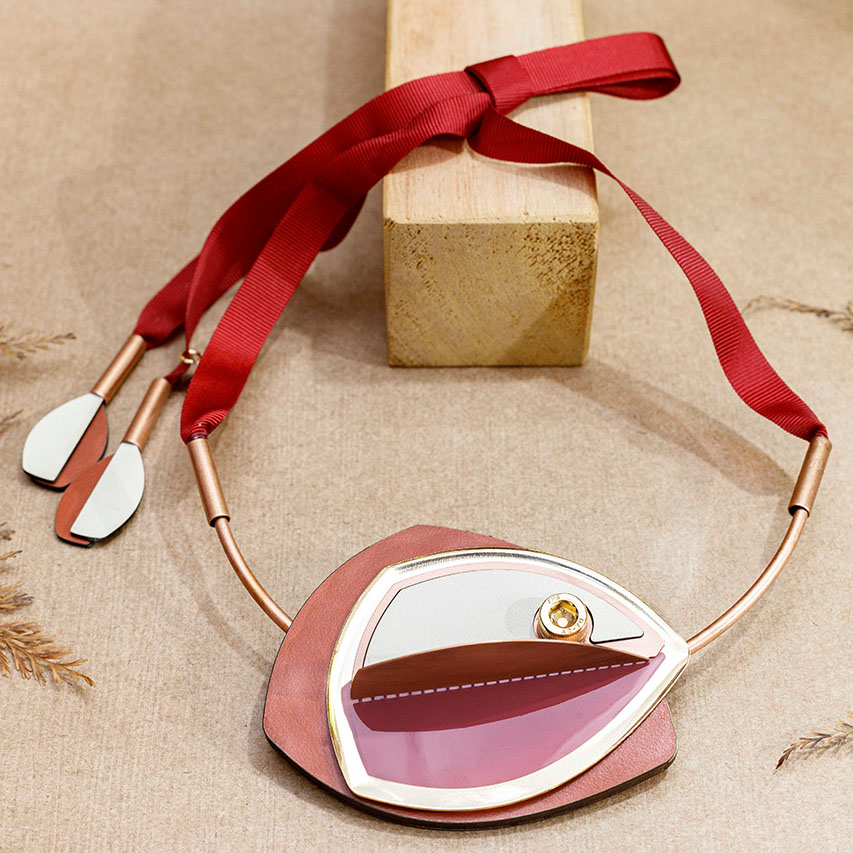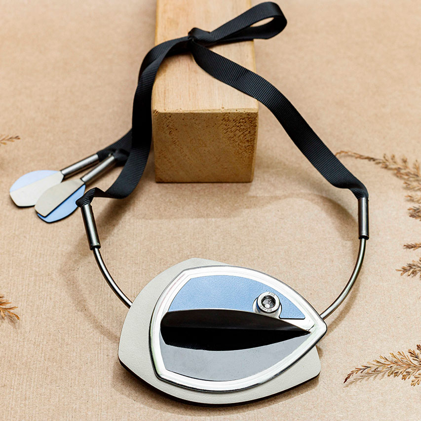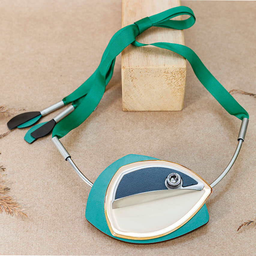 Necklace made from laser-cut formica foils. The glaze of the piece is hand made and finished with screws.