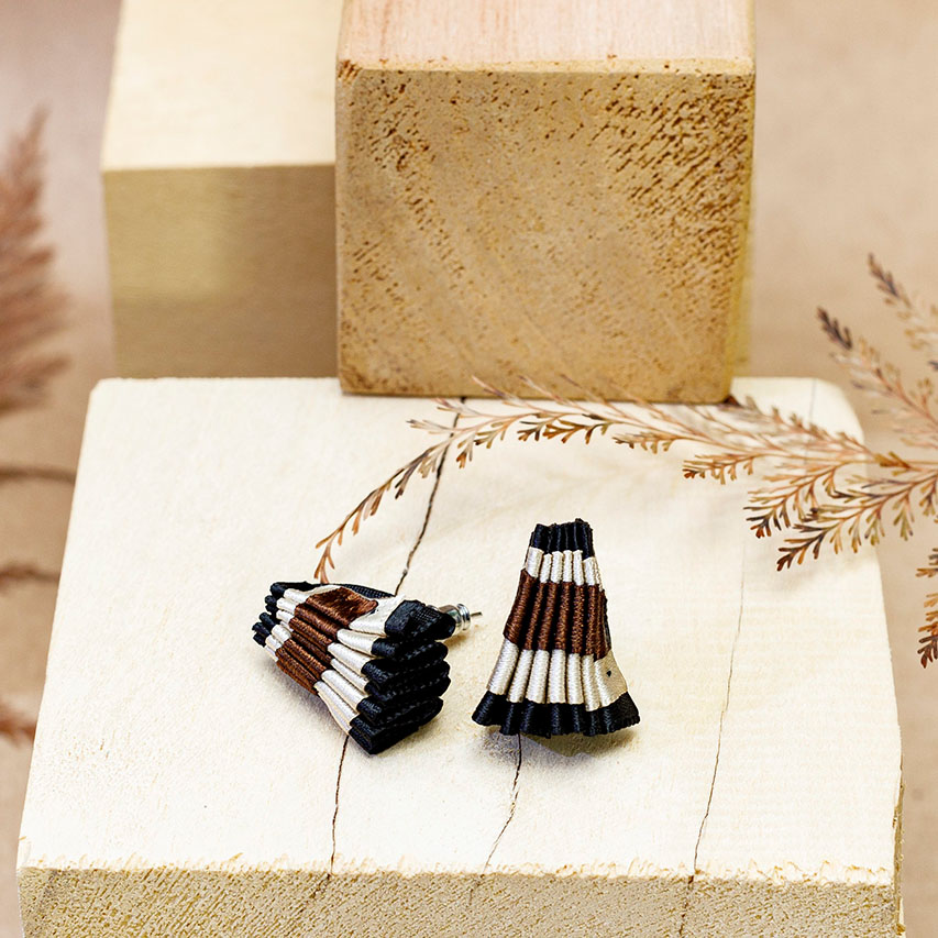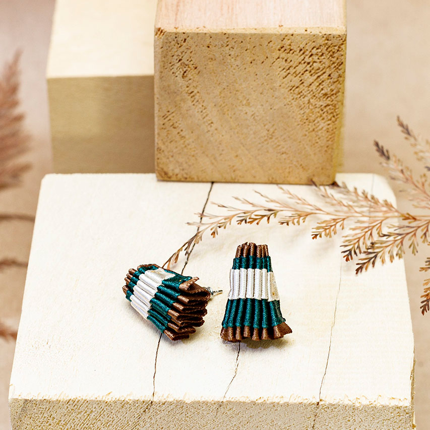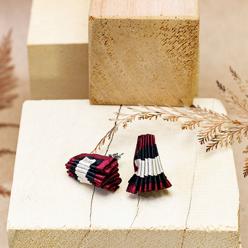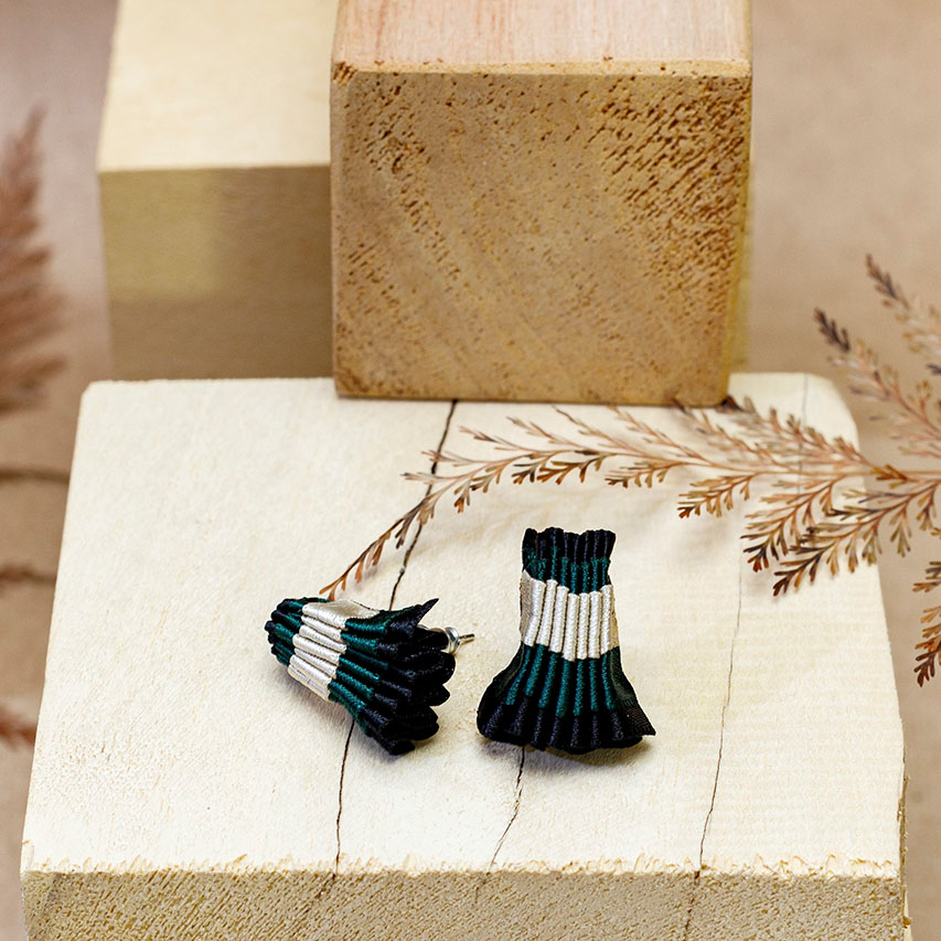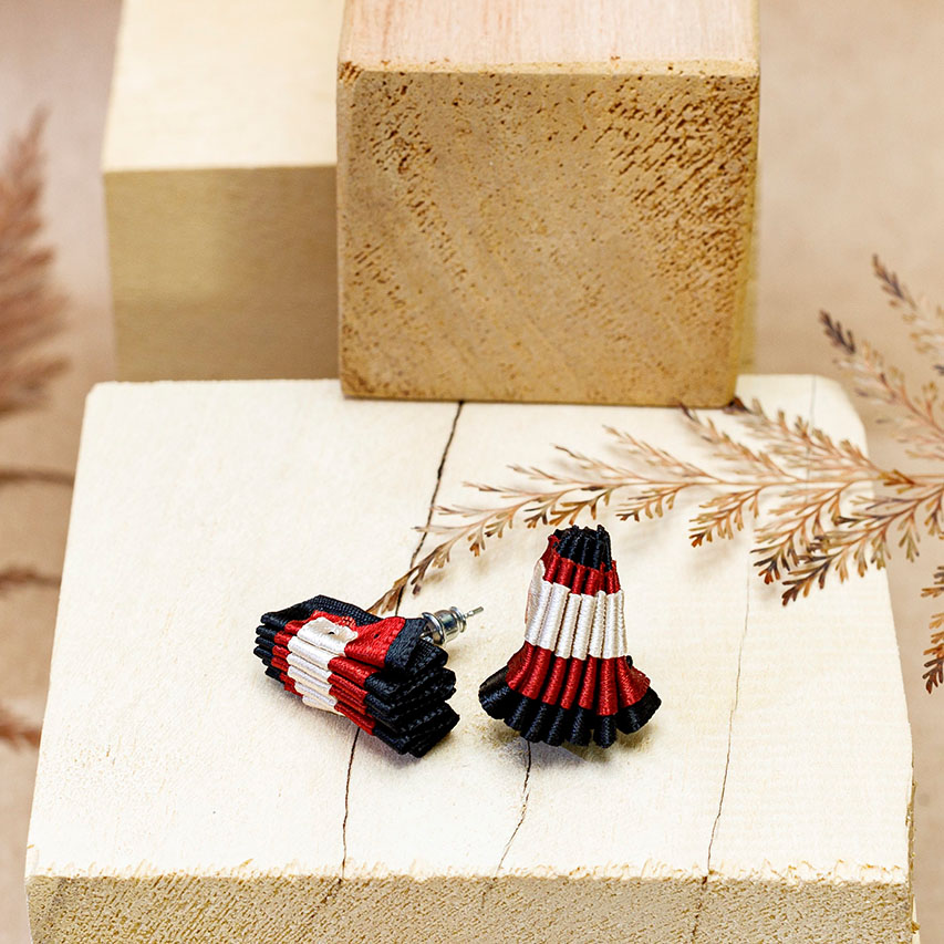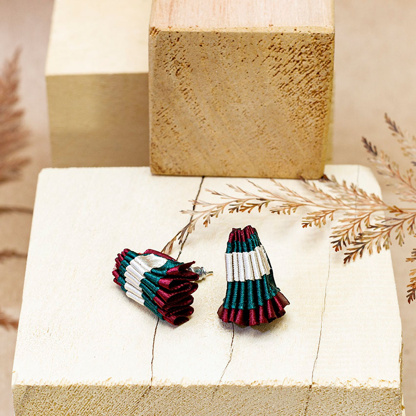Earrings made with 3 satin ribbons. Each ribbon is sewed overlapped. Earring parts touching the ear are made in metal.