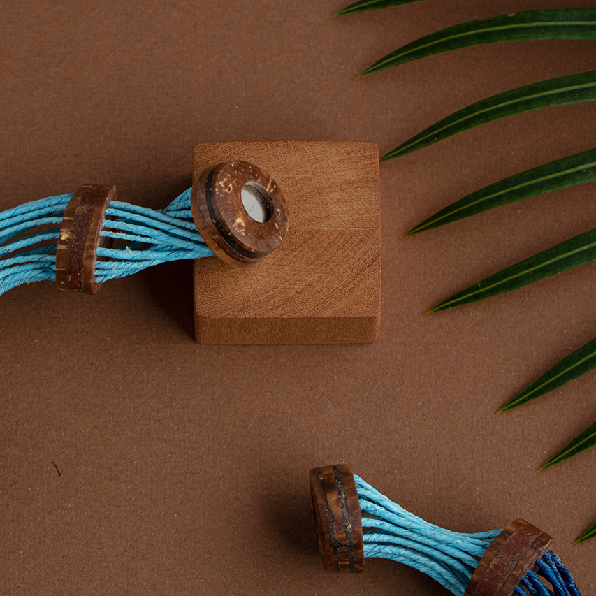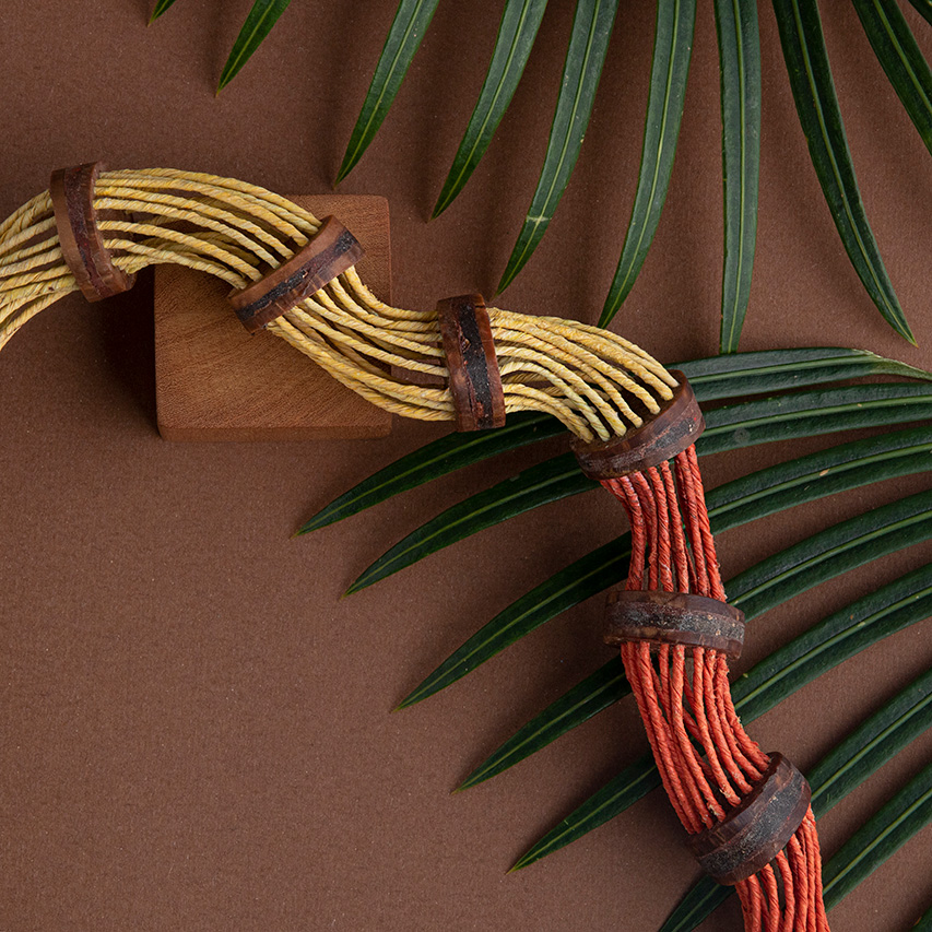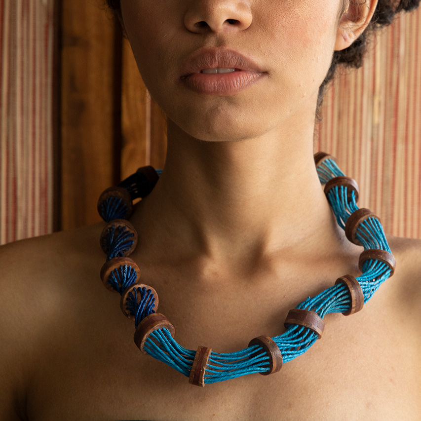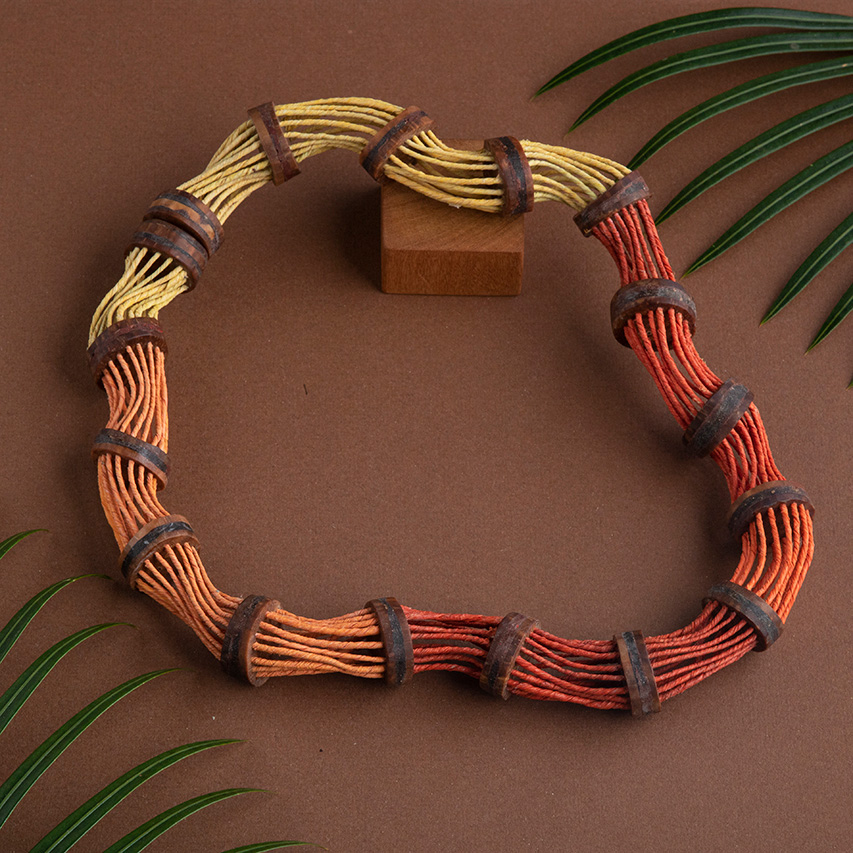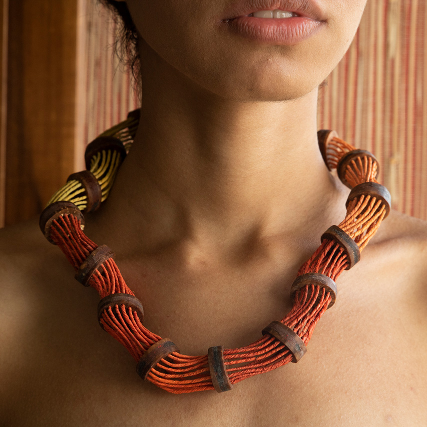 Handcrafted necklace. This necklace is made of reused plastic and piaçava coconut (Attalea funifera) from Bahia.