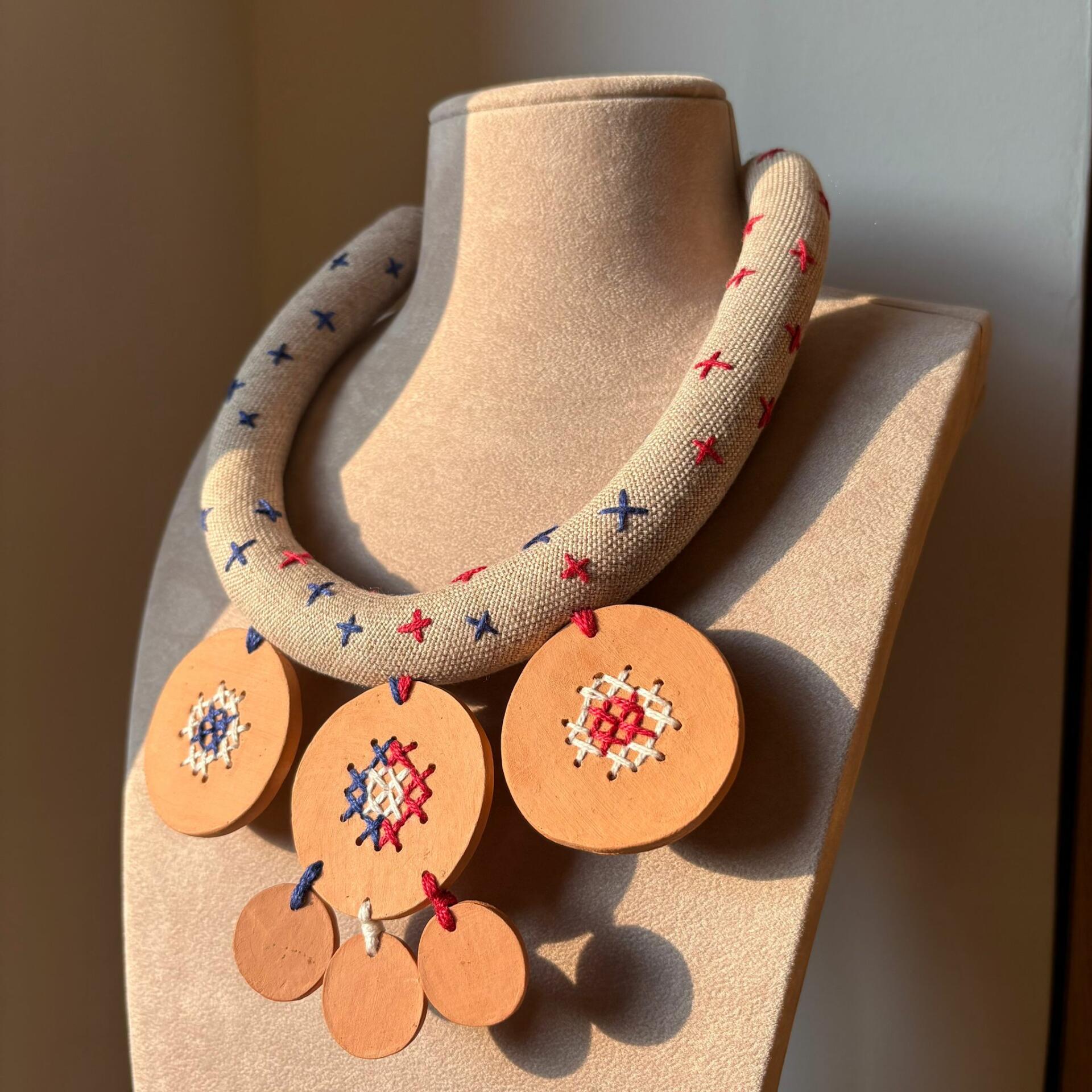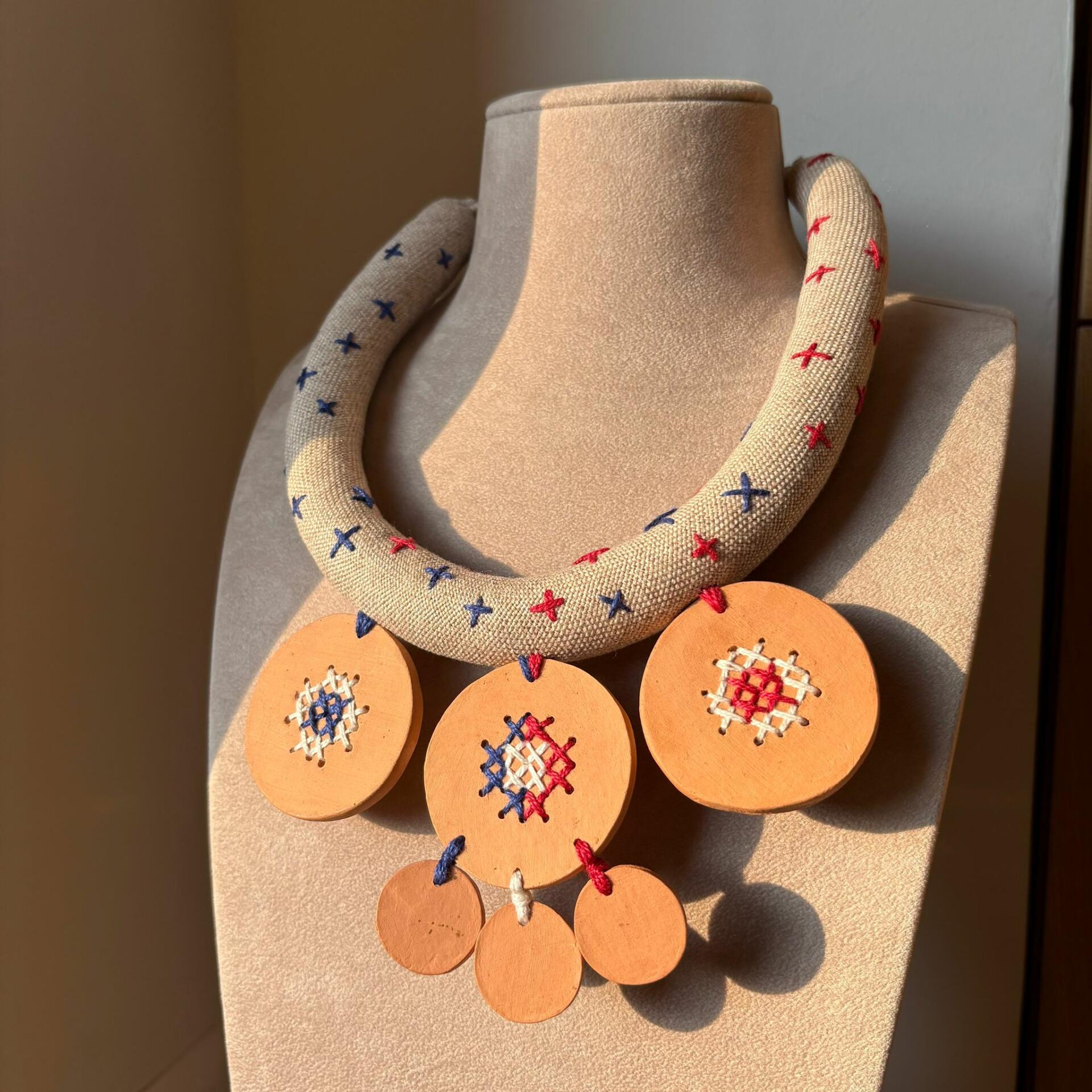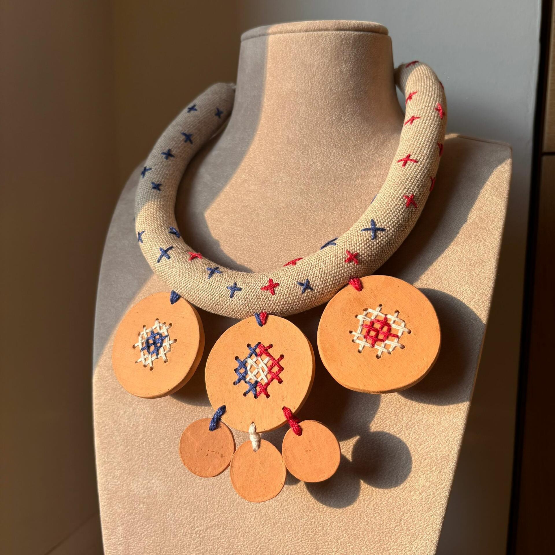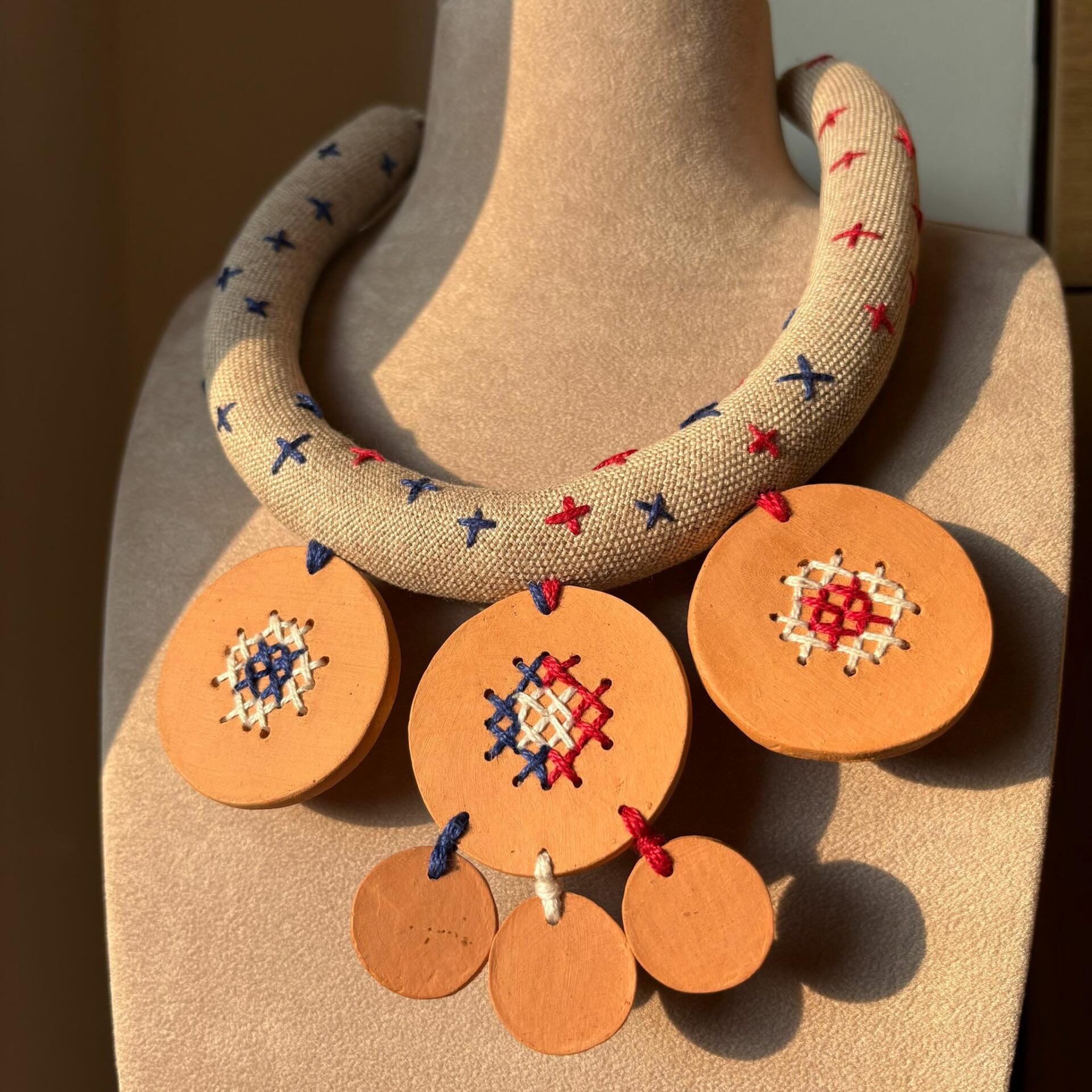 The ceramic pendant mirrors the same embroidered pattern, creating a harmonious dialogue between material and craftsmanship.
