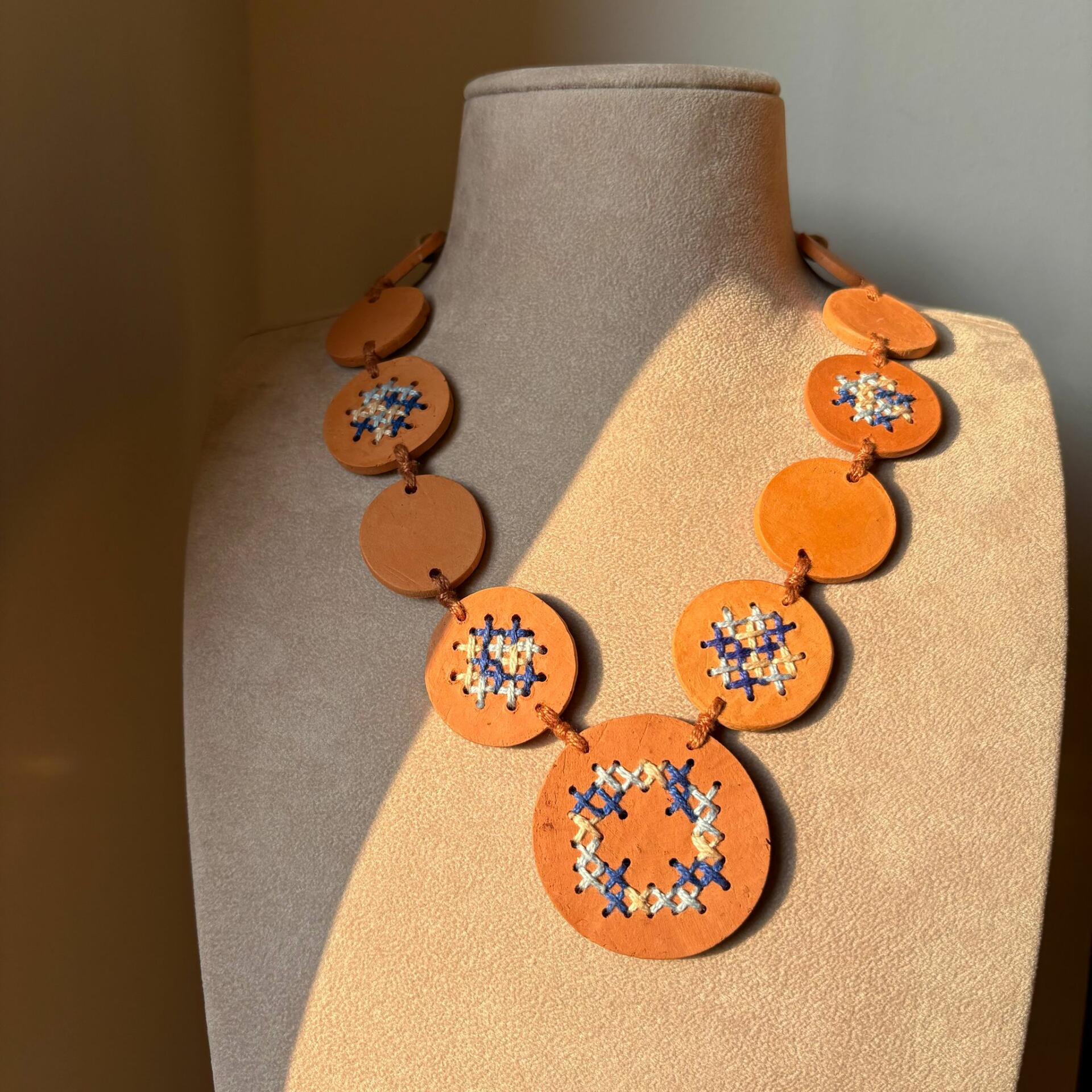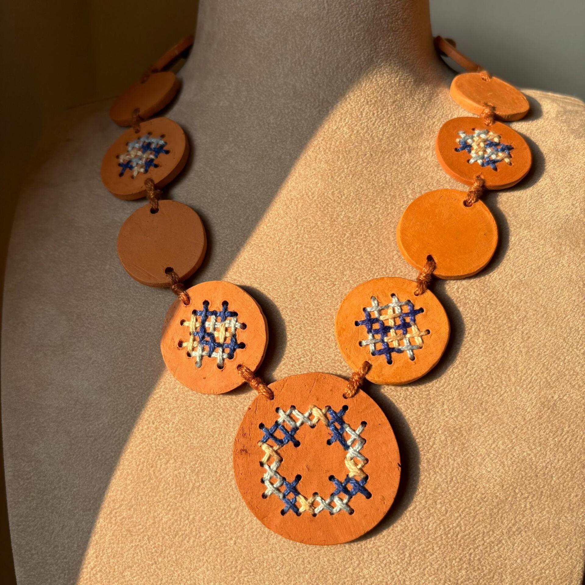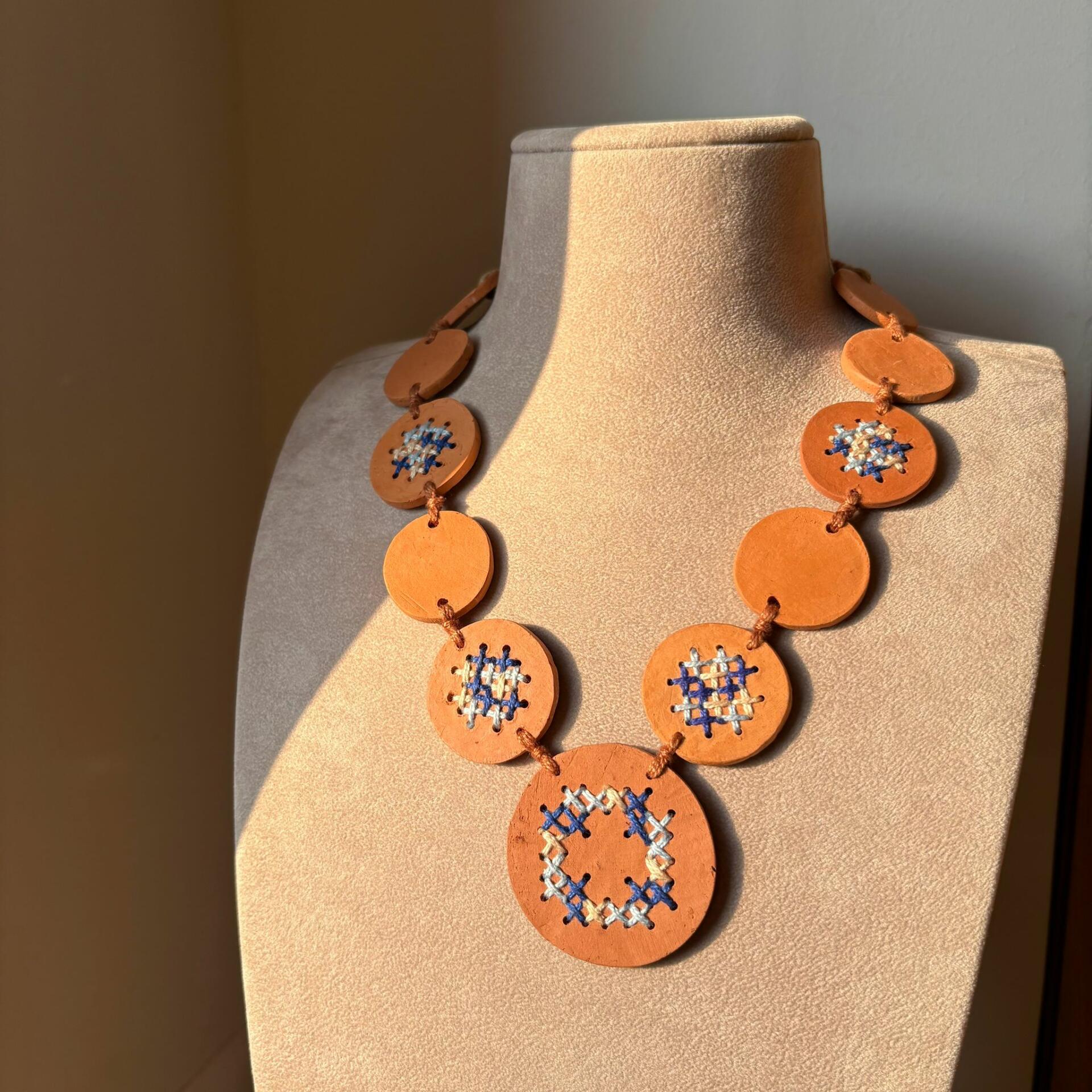 The ceramic part is crafted using a traditional embroidery technique, cross-stitch, creating a harmonious dialogue between material and craftsmanship.