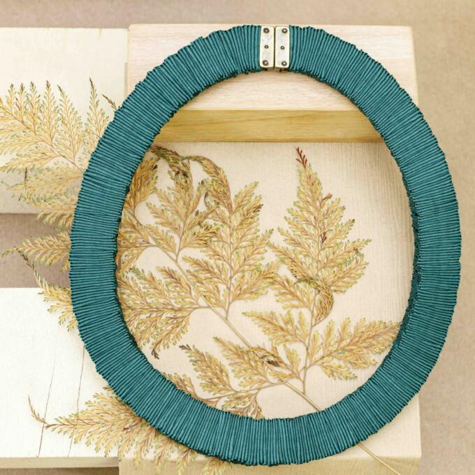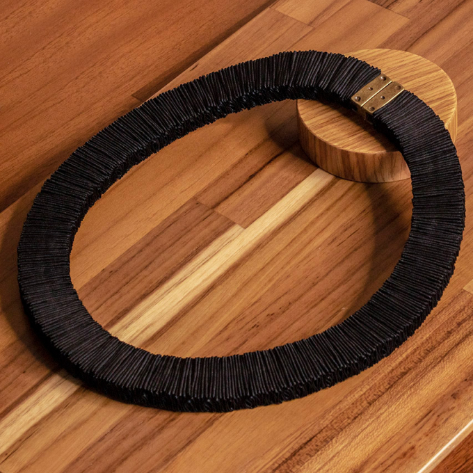 Thin necklace made with 3 satin ribbons. Each ribbon is sewed overlapped. The necklace can be used with both faces: a 3 colour and a single colour side.
