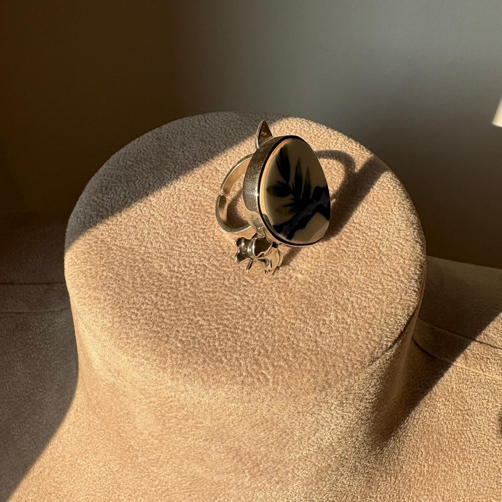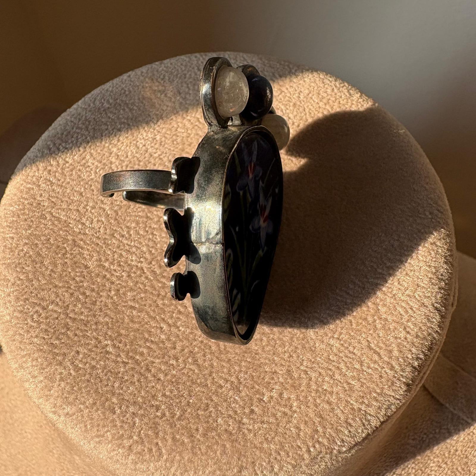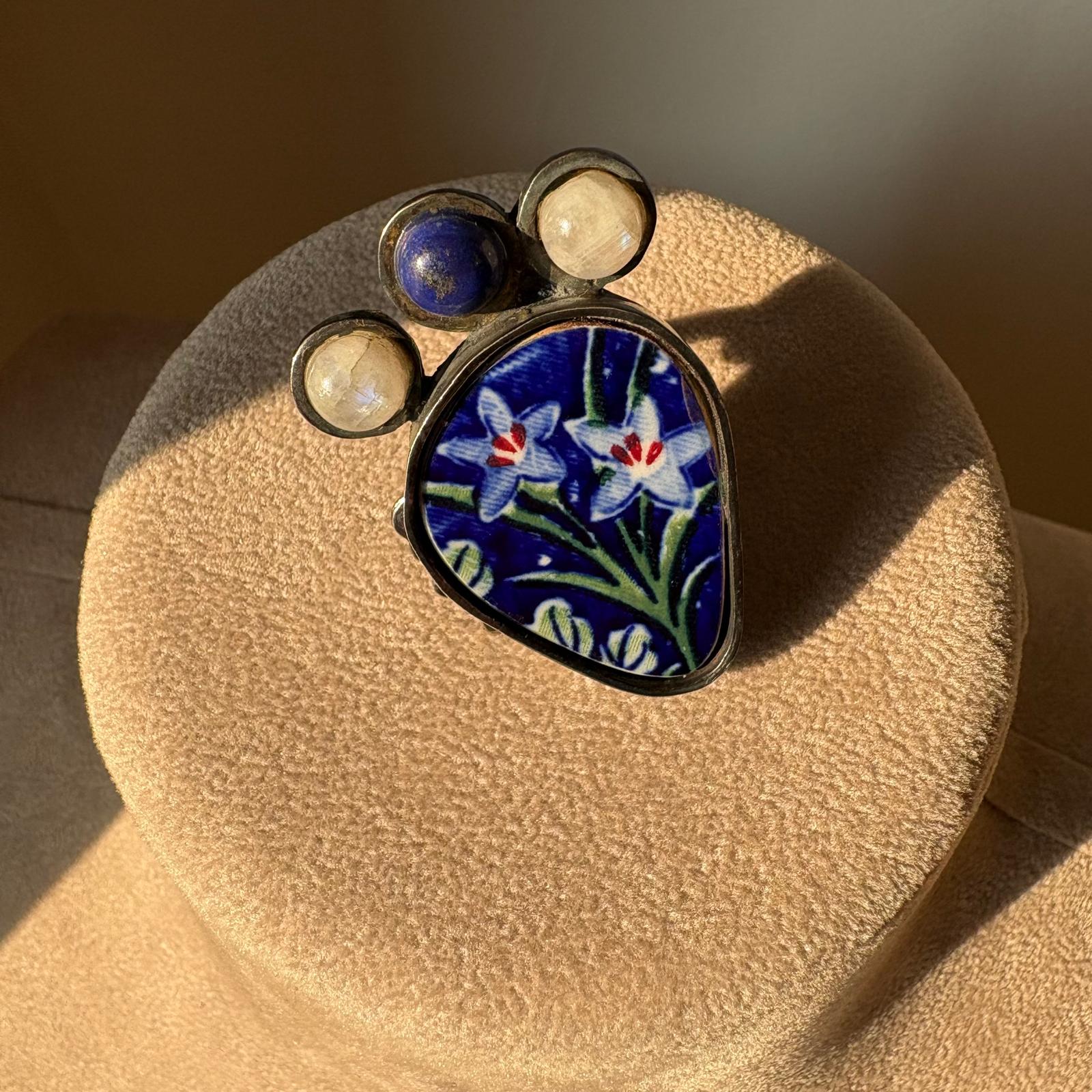 Materiali Modello 1 : gioiello realizzato interamente in argento 950, con dettagli in porcellana e 2 pietre di luna e 1 lapislazzuli.