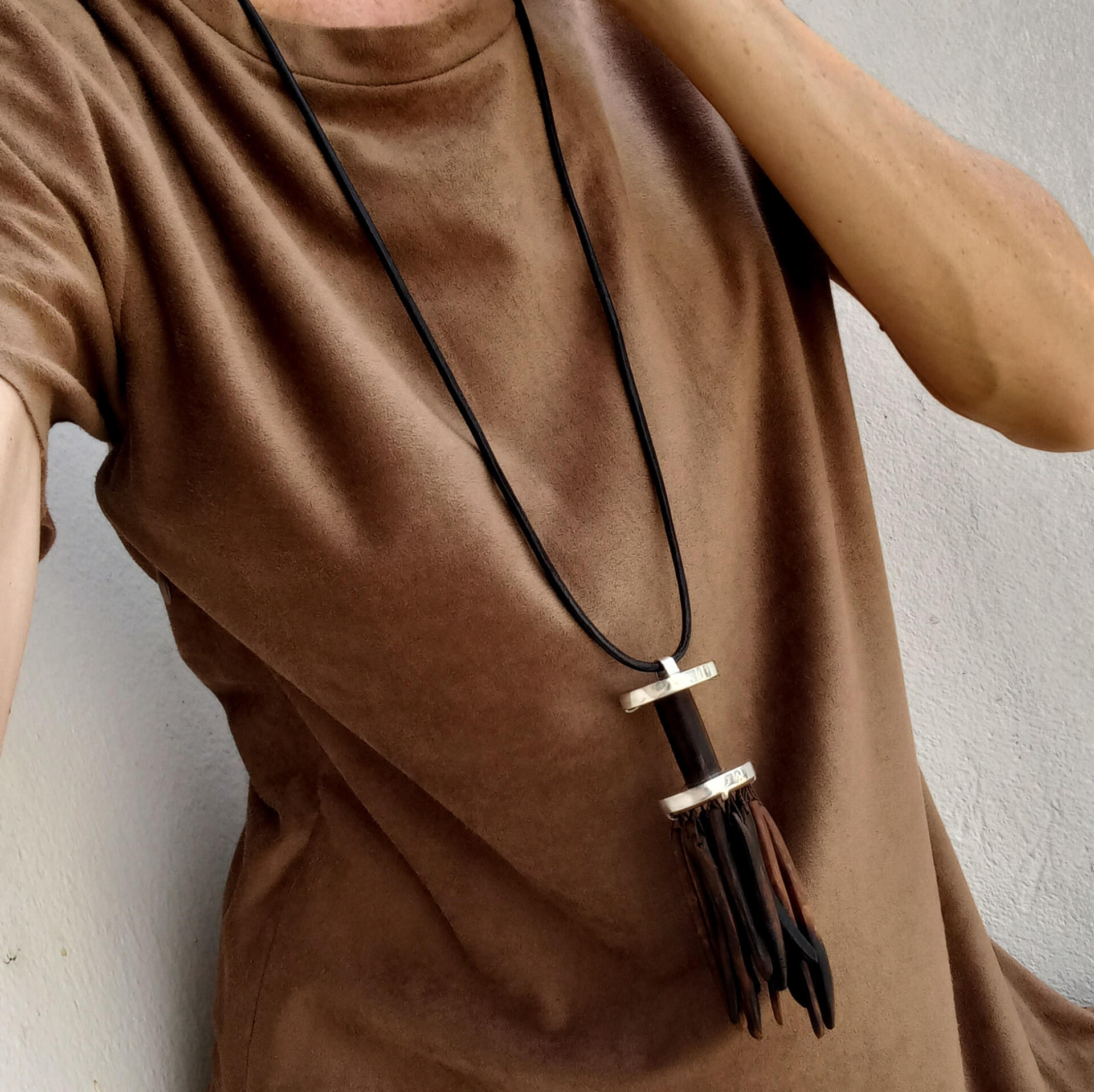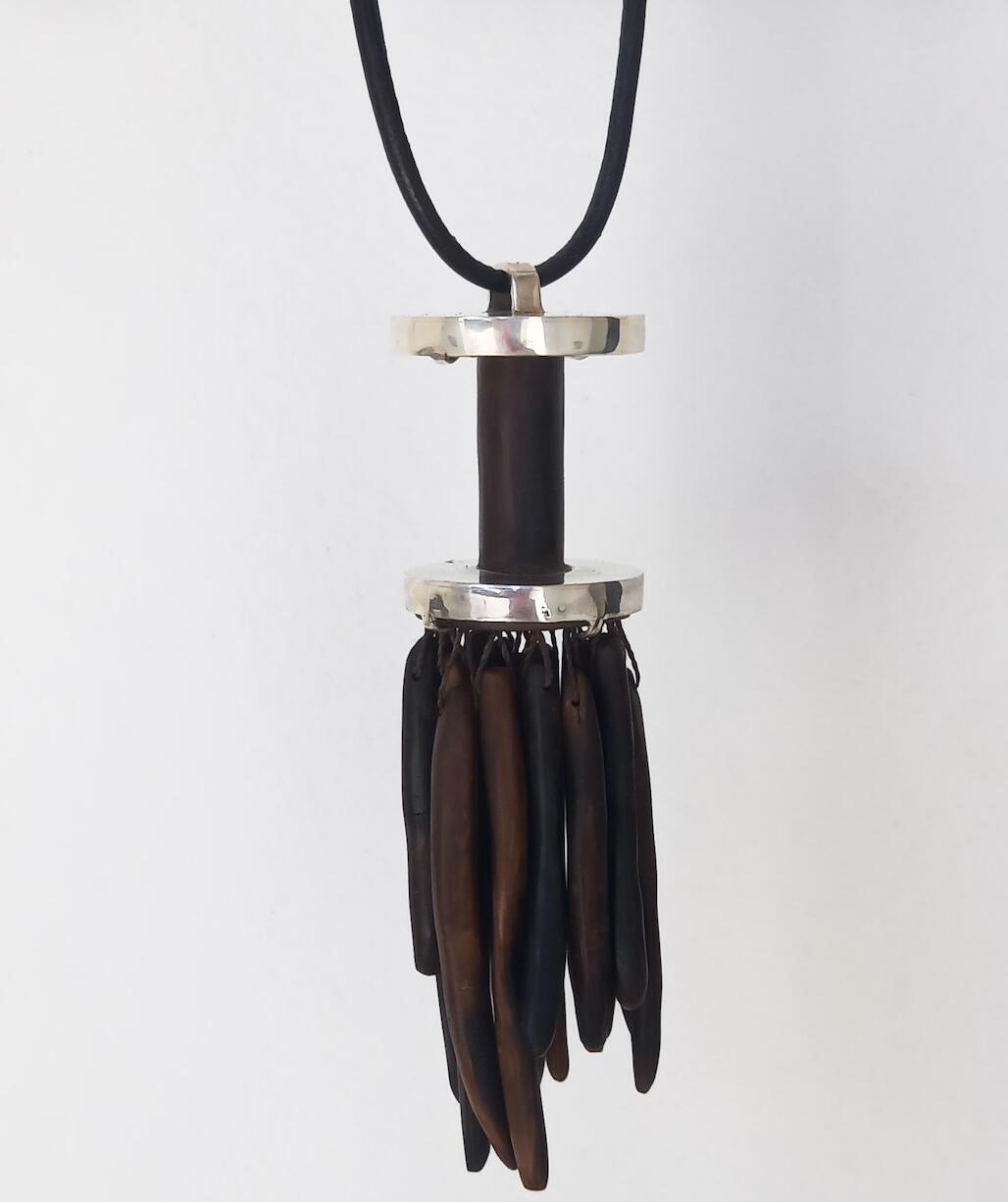 Materiali: realizzato con una materia prima locale brasiliana — il cocco dell’albero di piaçava (originario del Nordest del Brasile, nello stato di Bahia) abbinato all’argento. Il cordone della collana è il pelle.