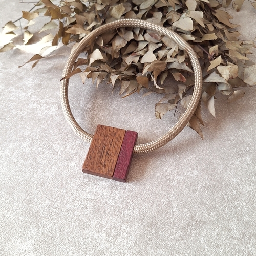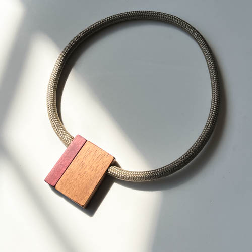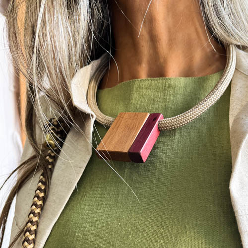 Collana in corda grigio chiaro e legni di recupero di Cedro e Roxinho. La chiusura magnetica garantisce praticità d’uso, rendendola un accessorio moderno, unico, facile da indossare e da abbinare.