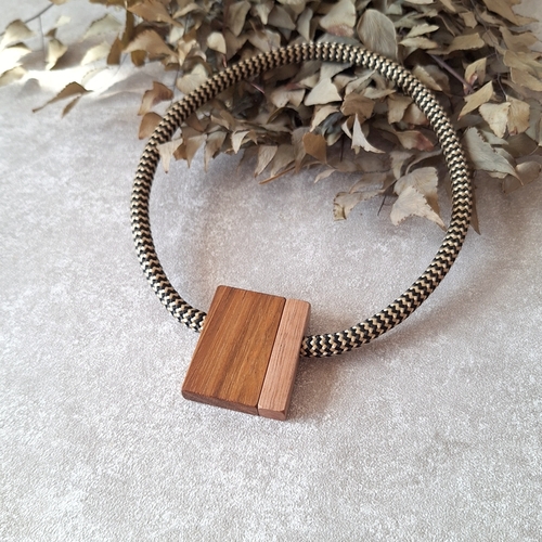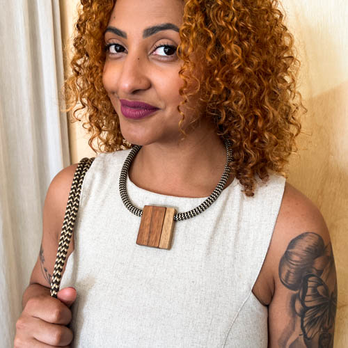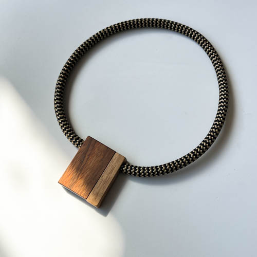 Collana in corda mélange e legni di recupero di Jatobá e Tauari. La chiusura magnetica garantisce praticità d’uso, rendendola un accessorio moderno, unico, facile da indossare e da abbinare.
