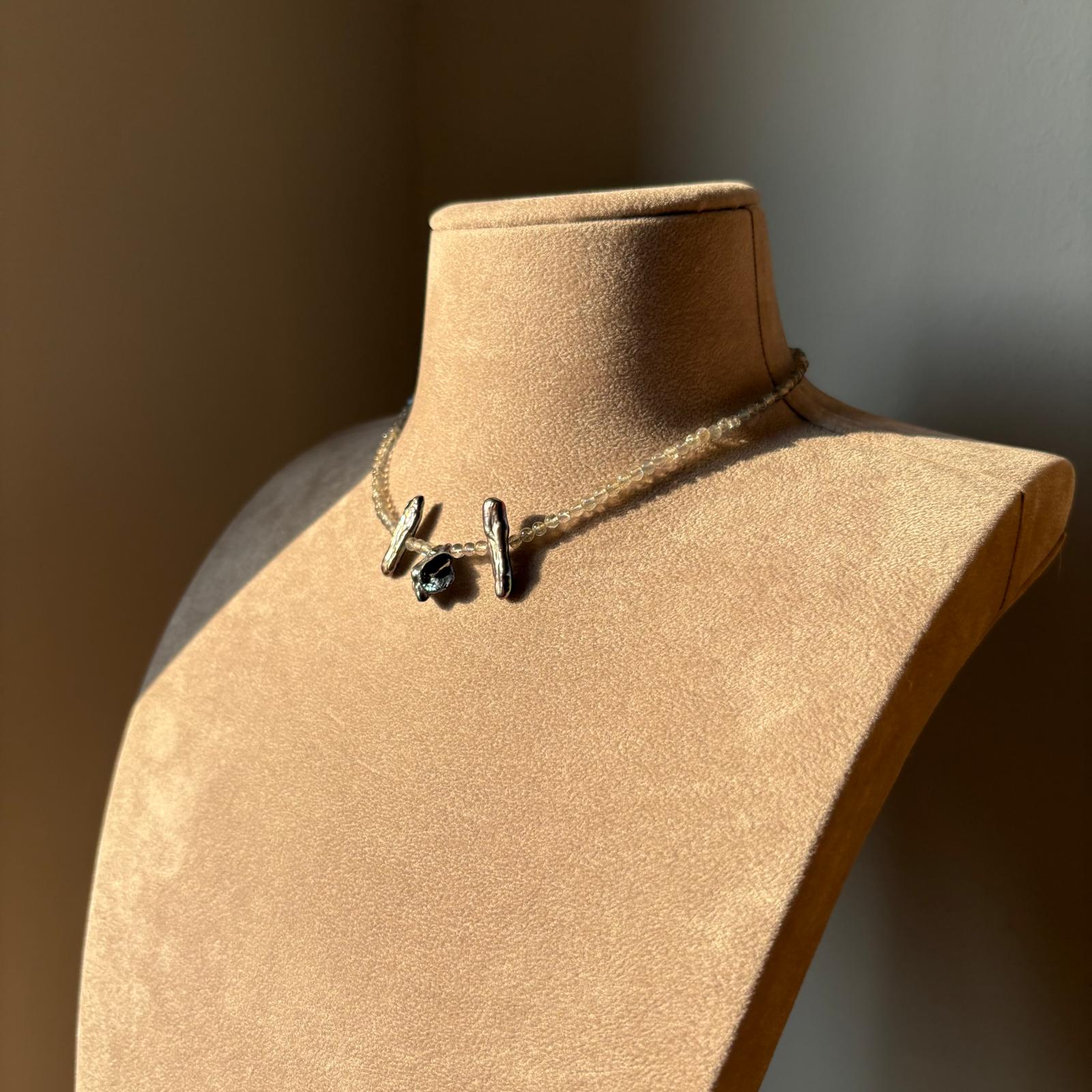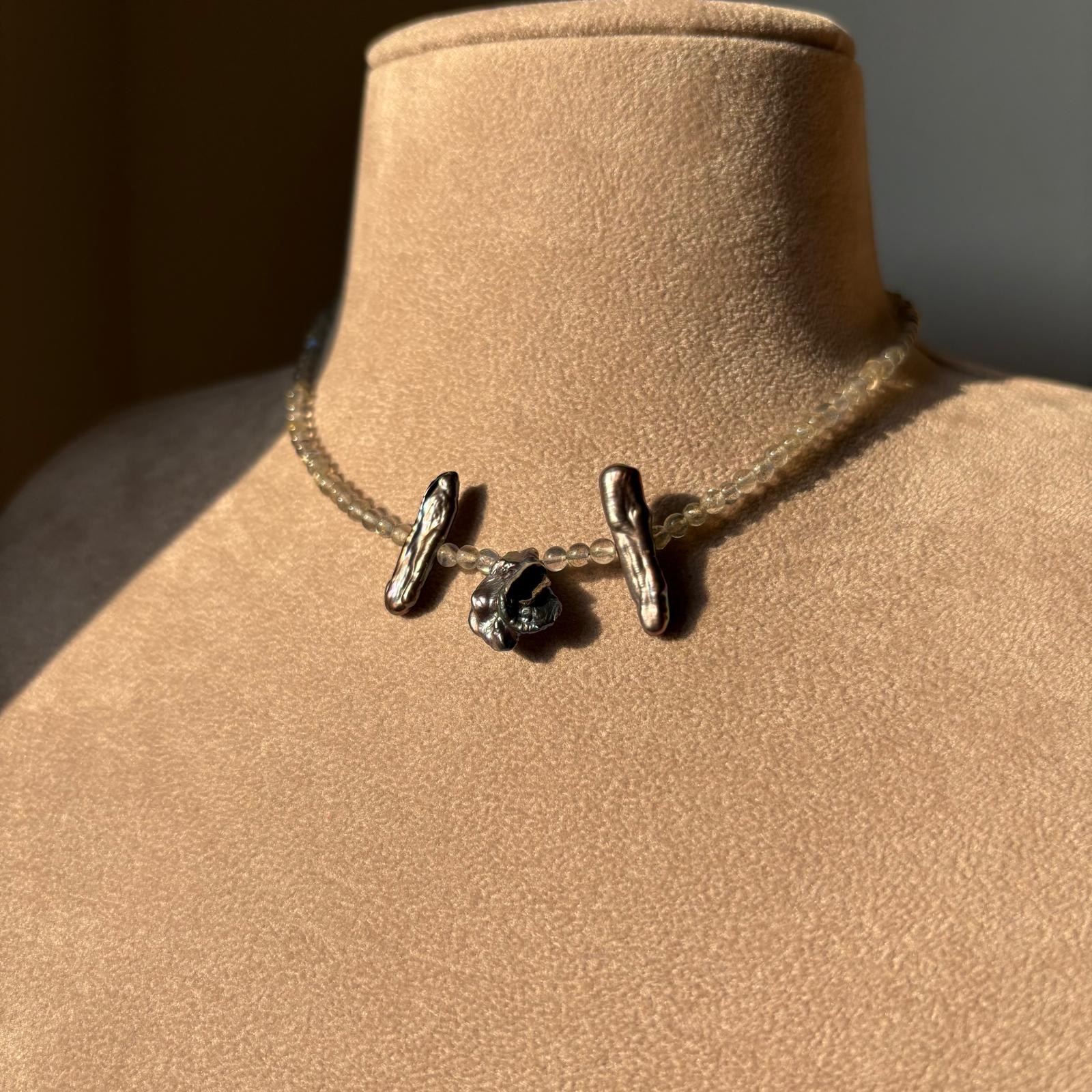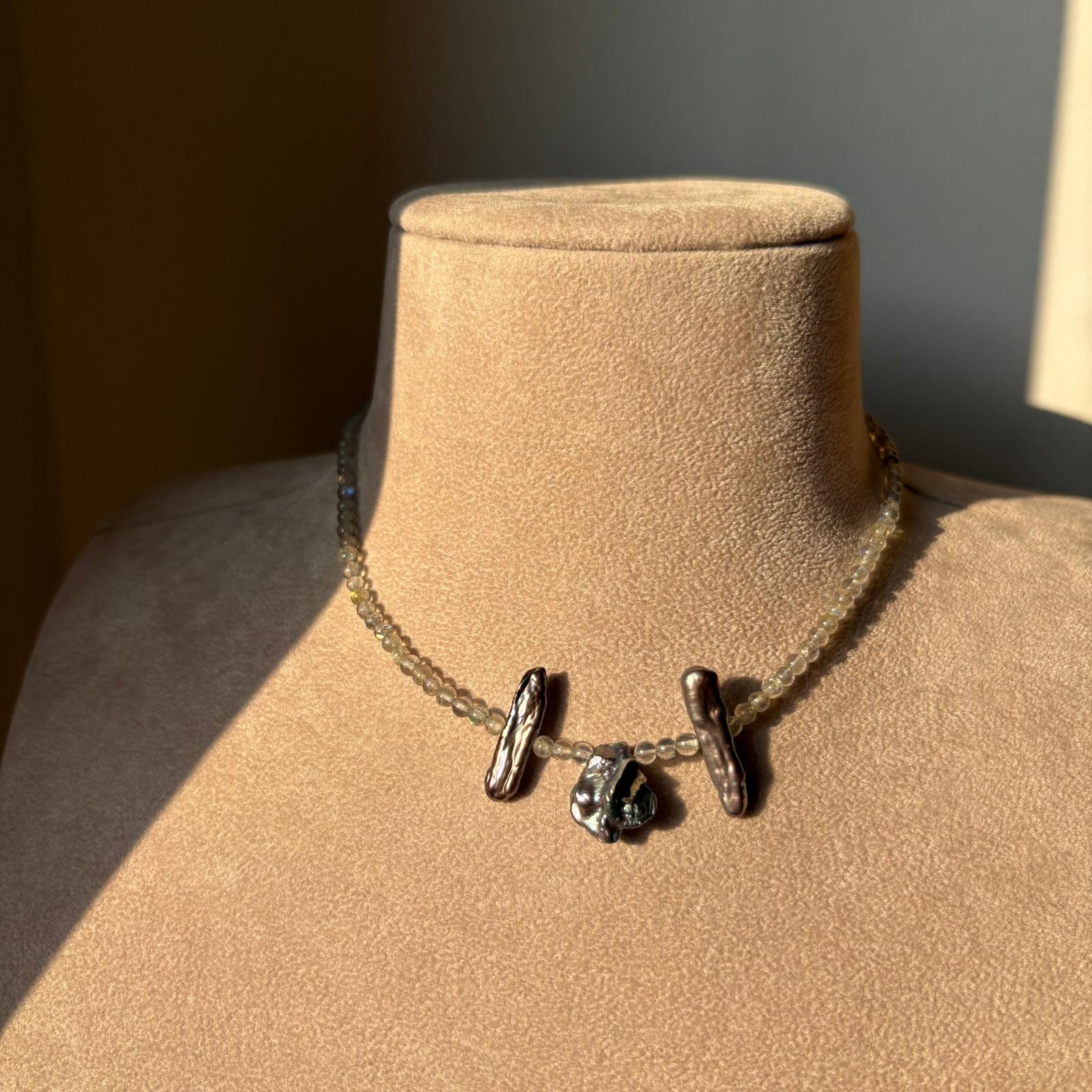 Collana perline di labradorite e tre perle d’acqua dolce