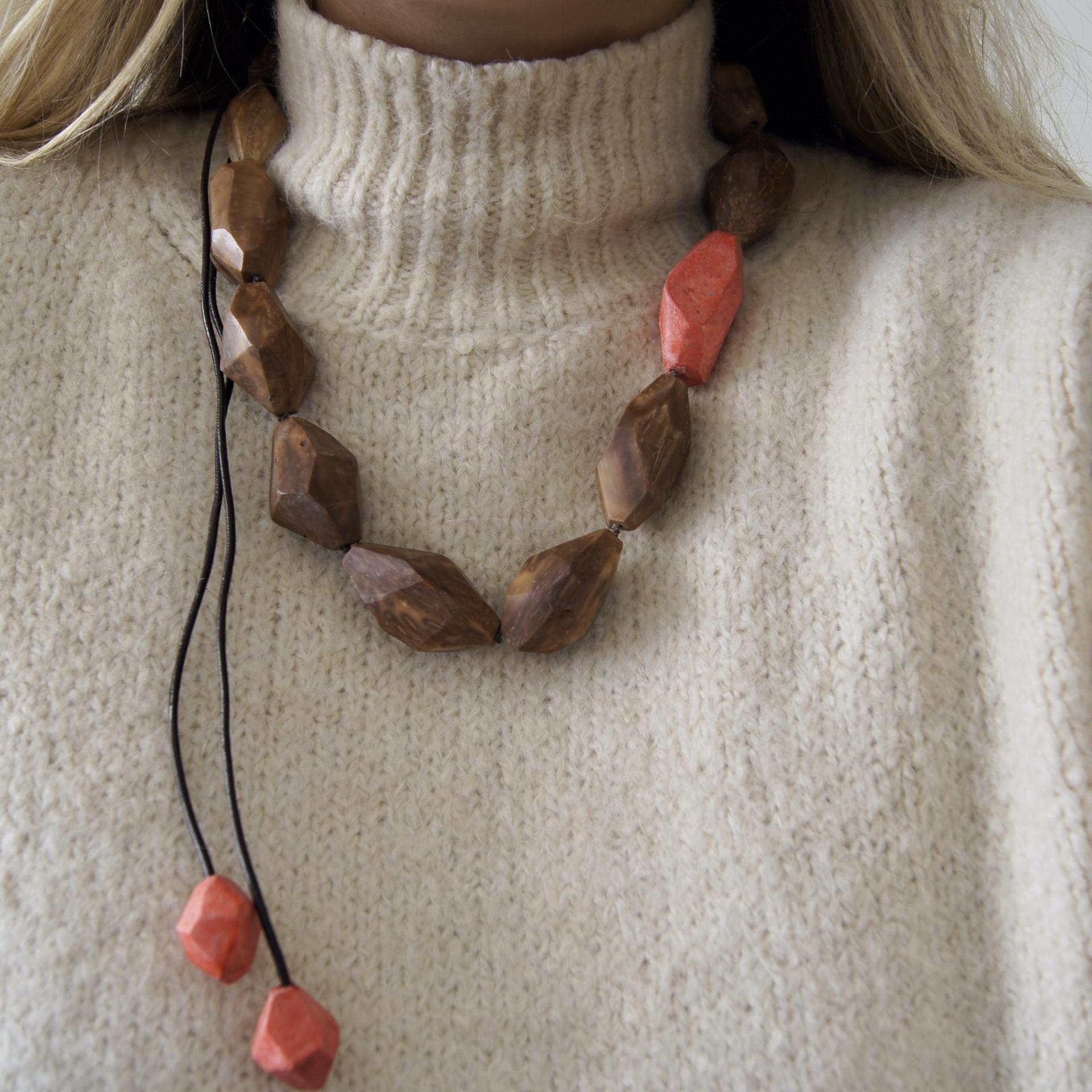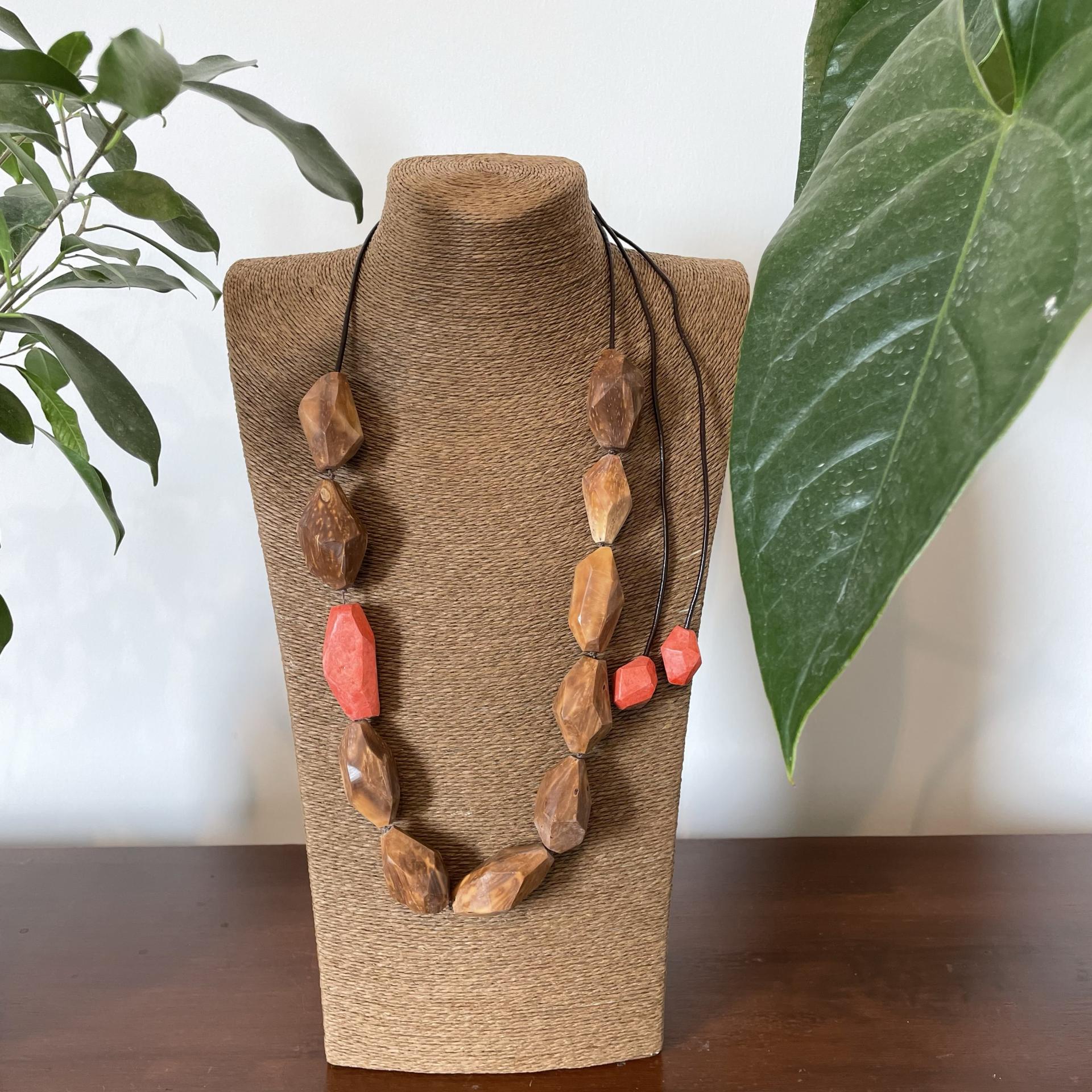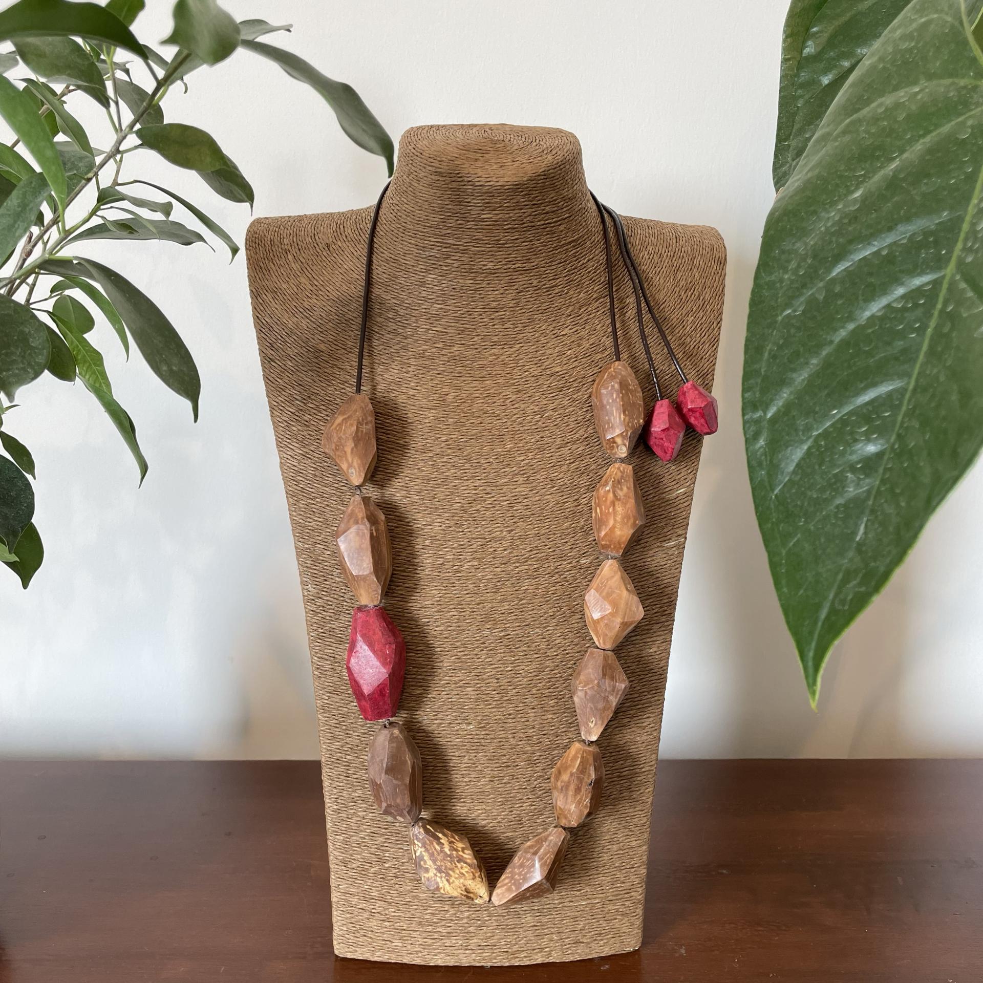 Collana realizzata utilizzando principalmente il cocco dell’albero di Piaçava (Attalea Funifera) originario dello stato di Bahia e la parte colorata è in carta colorata.