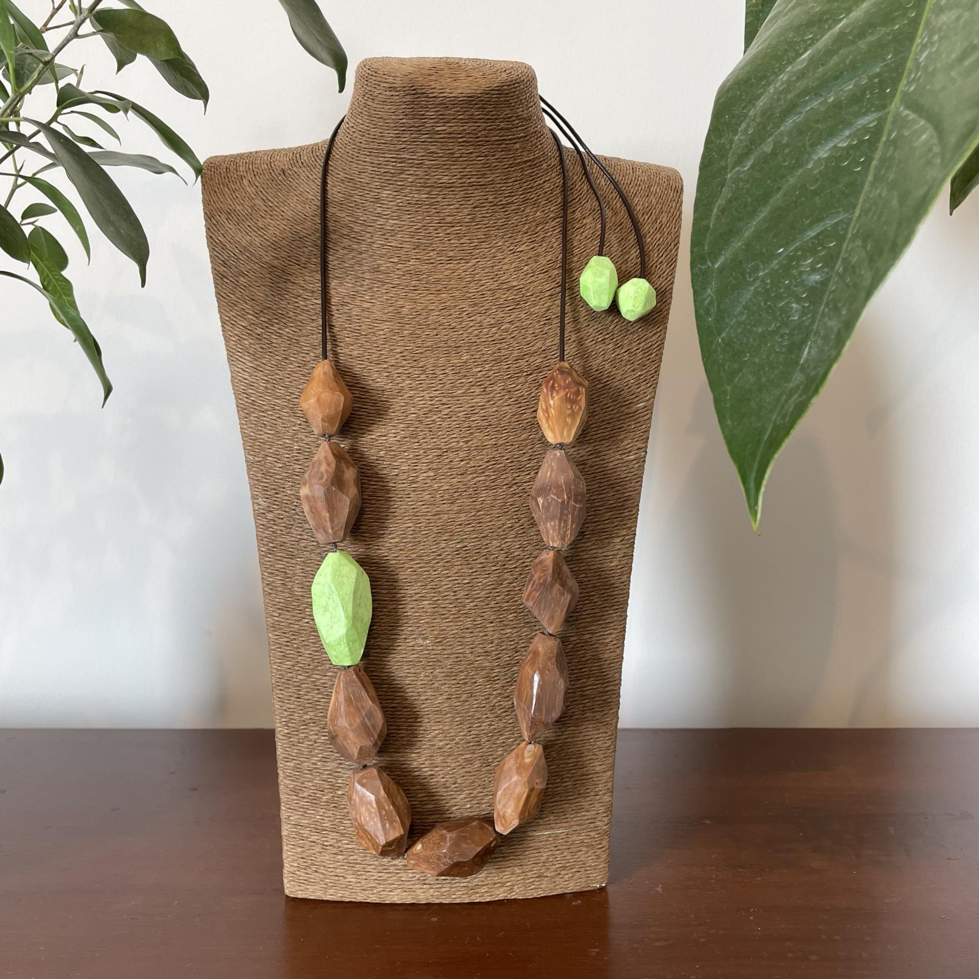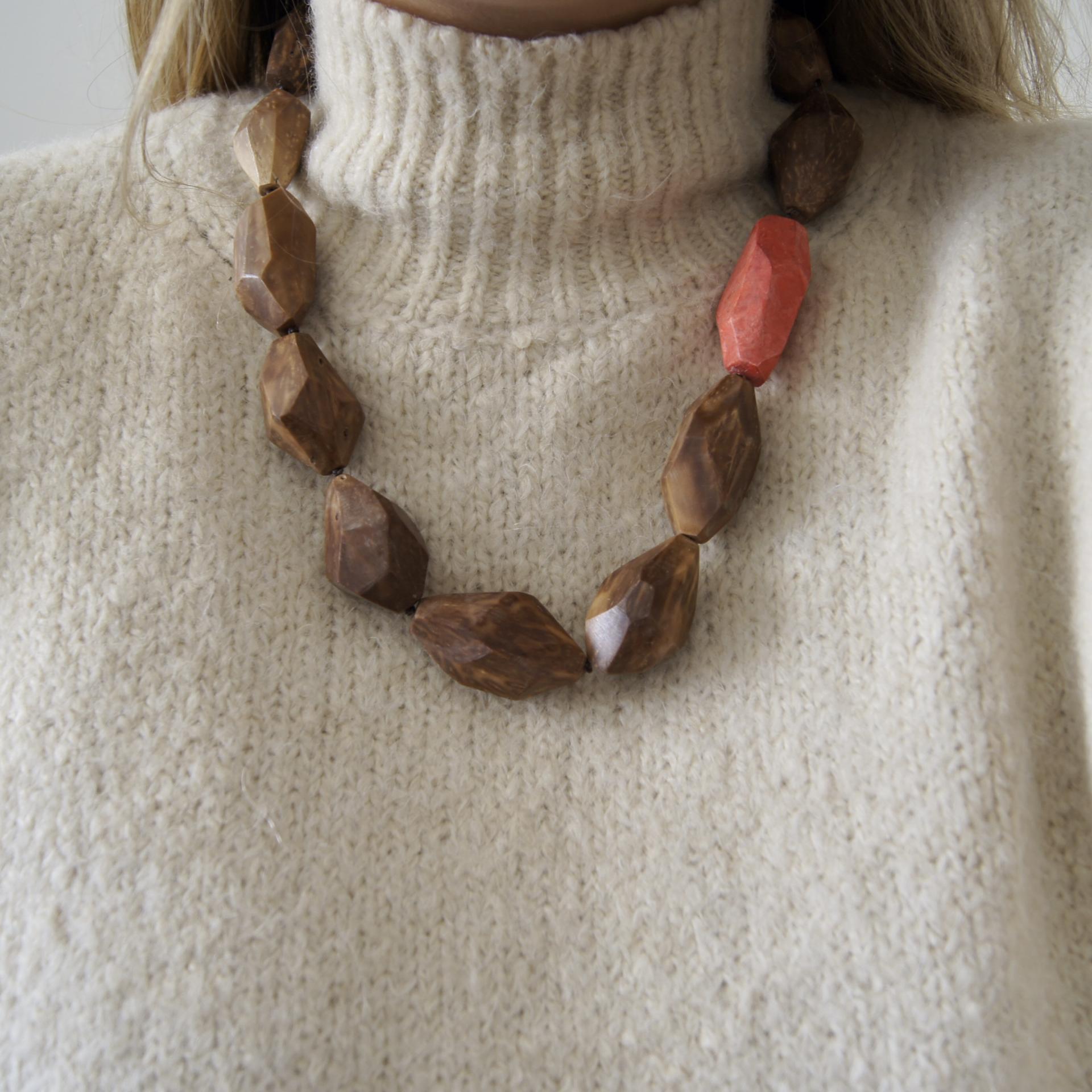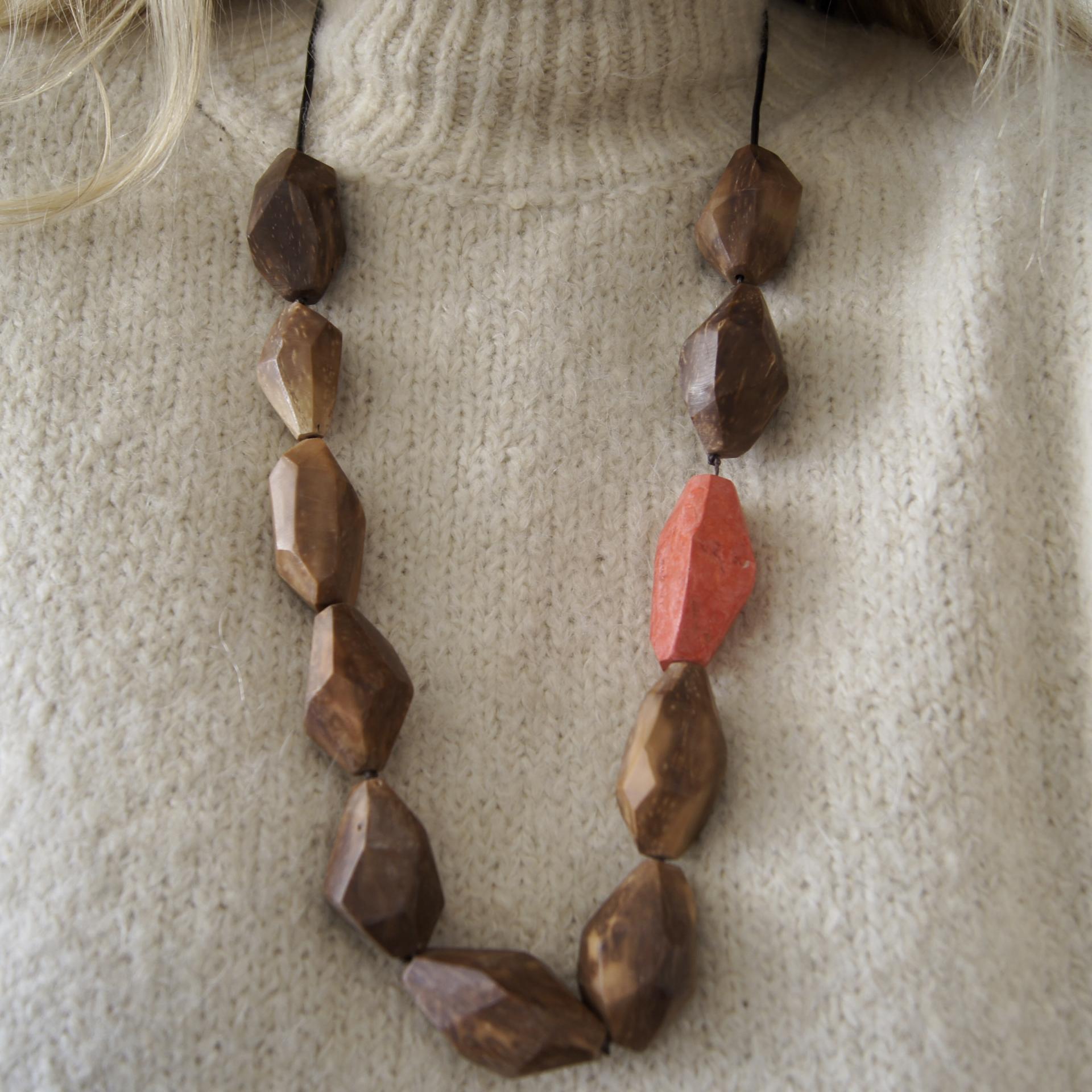 Collana realizzata utilizzando principalmente il cocco dell’albero di Piaçava (Attalea Funifera) originario dello stato di Bahia e la parte colorata è in carta colorata.